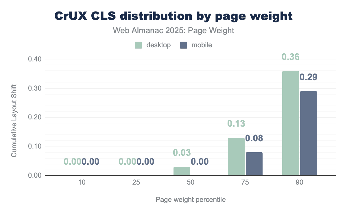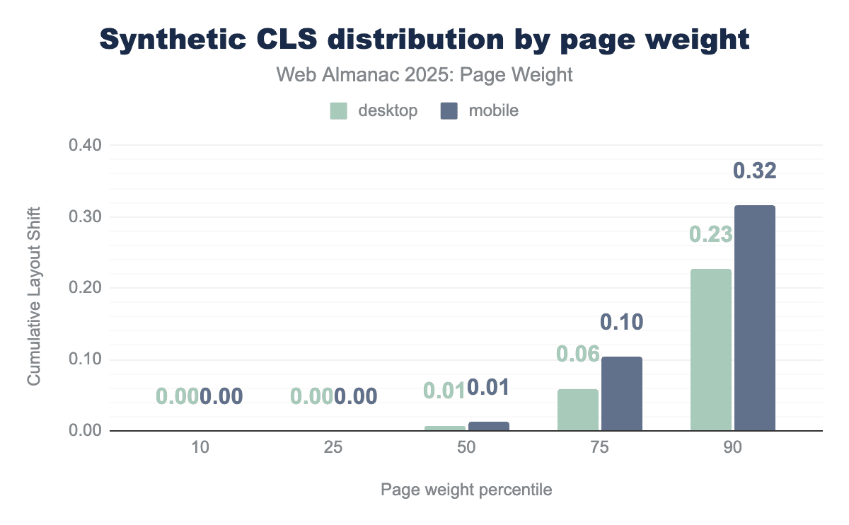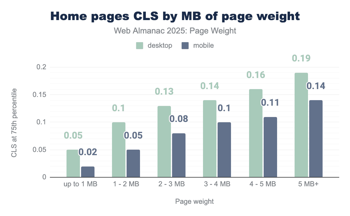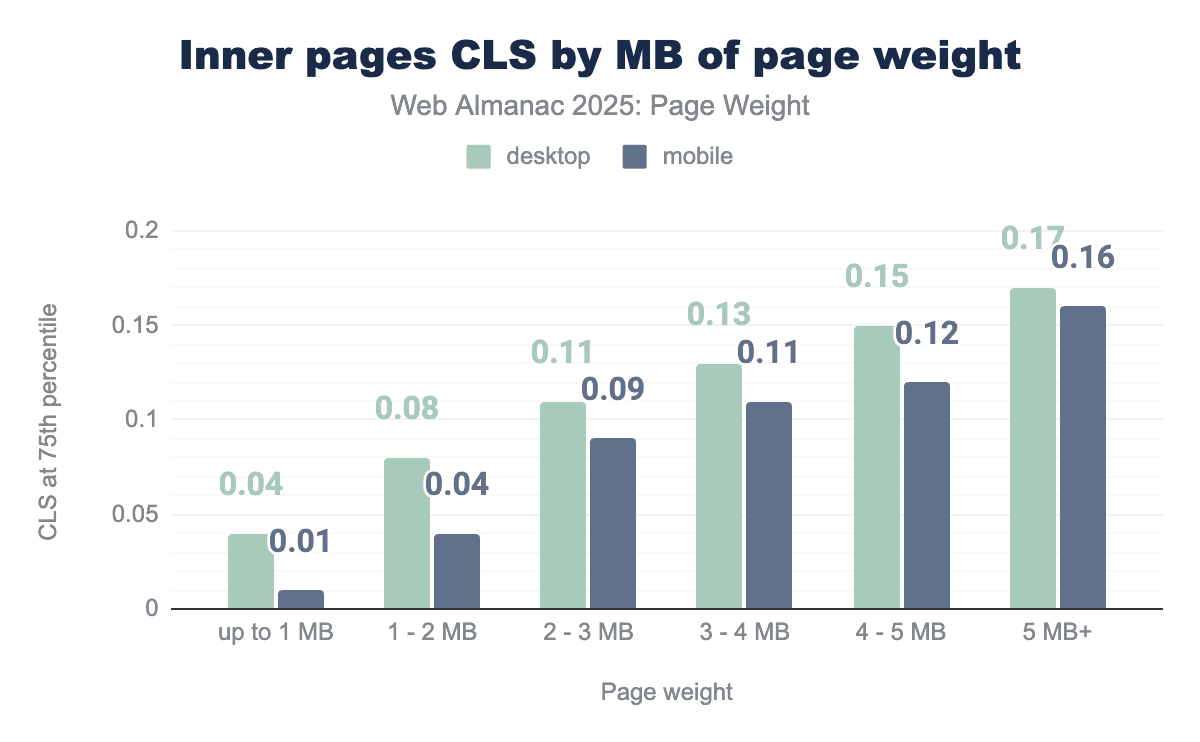 A passing CLS score is ≤ 0.10. CLS scores were consistently higher on desktop, likely because the larger landscape provides more space for items to shift. Pages below 2 MB passed the assessment on desktop, while pages below 4 MB achieved the desired score on mobile.