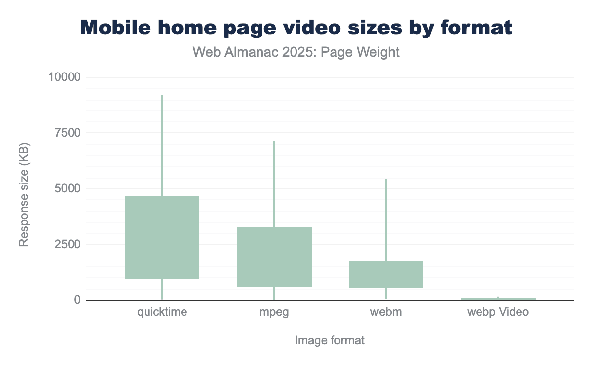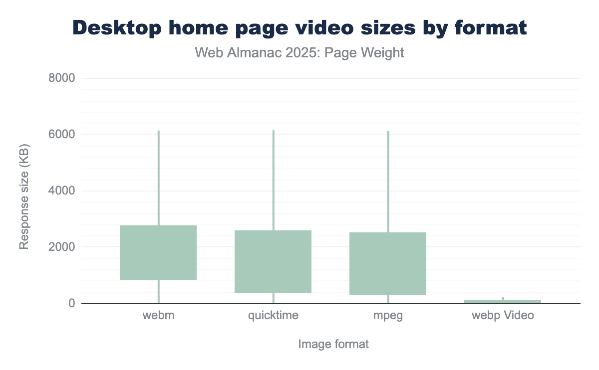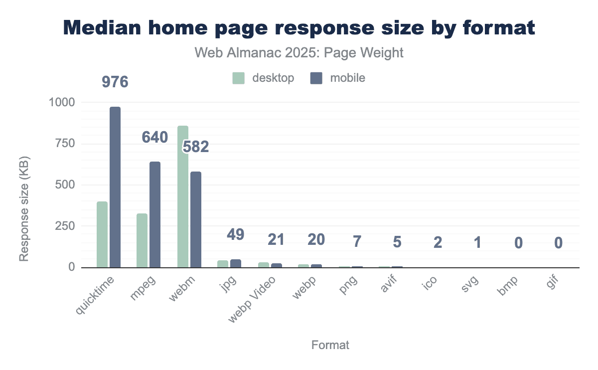 The largest file types, QuickTime and MPEG, are used for video. The median mobile home page used 976 KB of QuickTime, 244% more than desktop’s 400 KB. Similarly, the median mobile home page used 196% more MPEG bytes than desktop. The third-largest file type was WebM, a video format optimized for faster loading and lower bandwidth usage. Despite being ideal for mobile connections, more WebM bytes were shipped for desktop.