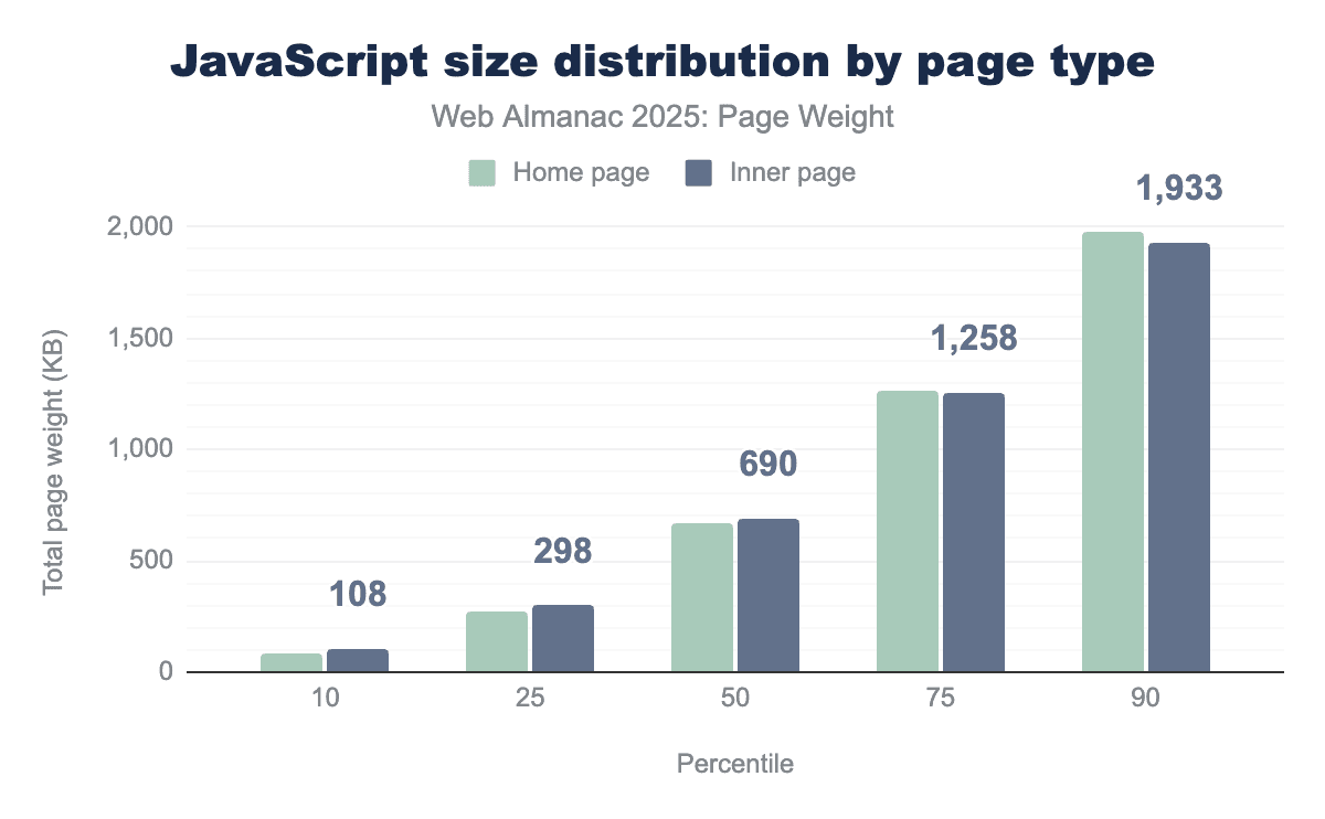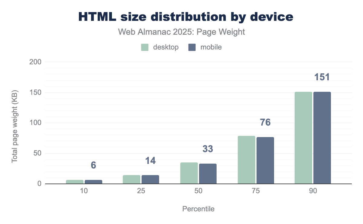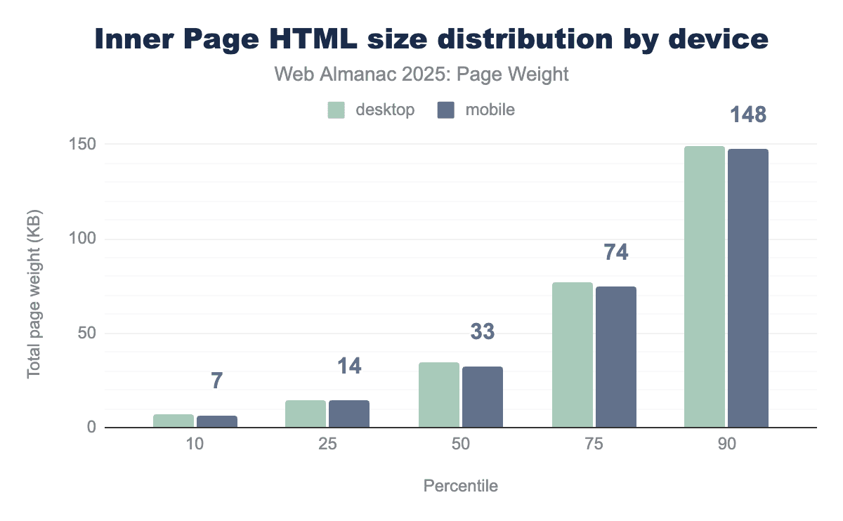 Year over year, the median home page size grew 7.8% to 2.7 MB. The median mobile home page is 2.6 MB, growing 8.4% from 2.4 MB in 2024. In 2025, the median desktop page size reached 2.9 MB, up 7.3% from 2024’s median of 2.7 MB.