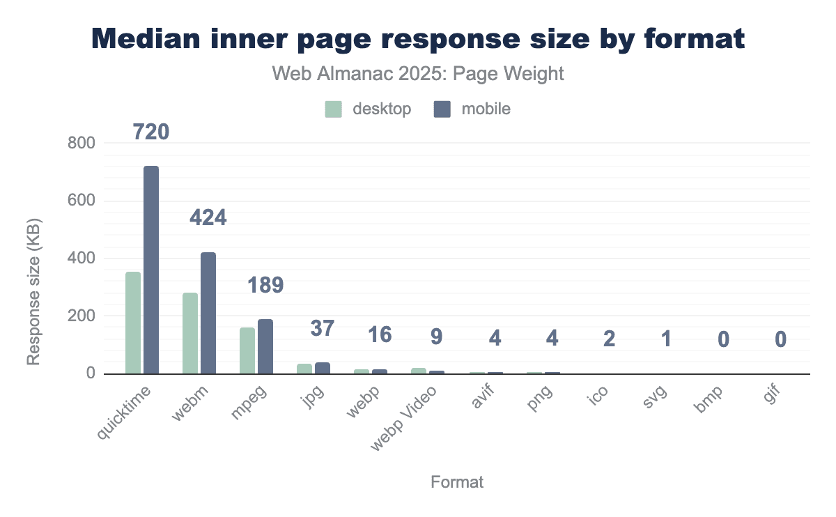 For median inner pages, QuickTime files remained the largest file type in bytes. Mobile saw 720 KB compared, 202% the 352.6 KB found on desktop. WebM surpassed MPEG as the second-largest file type for inner pages, at 423.6 KB on mobile and 280.8 KB on desktop. These were followed by MPEG, with more even distribution between device types (161.6 KB desktop; 188.8 KB mobile) than seen on home pages.