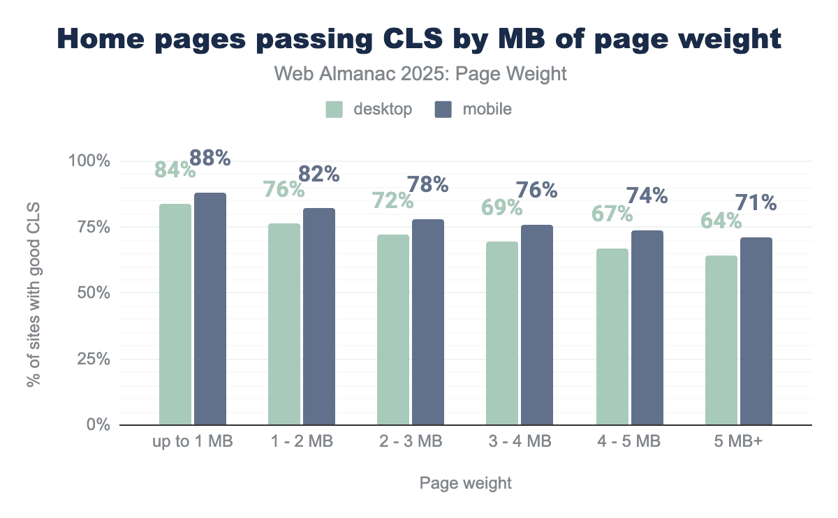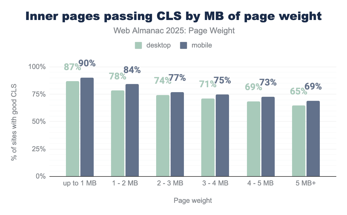 At the 75th percentile, 72% of desktop and 78% of mobile home pages in the 2-3 MB range meet the CLS recommendation. These pages represent the median page in 2025. CLS saw less drop off between percentiles than LCP. 88% of mobile pages under 1 MB passed. 71% of mobile pages still passed when the page weight exceeded 5 MB.