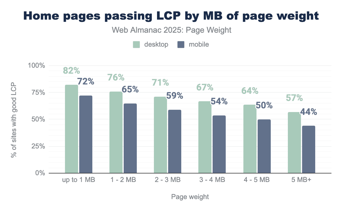 For home pages in the 2-3 MB range, LCP was achieved in 2.7 seconds on desktop and 3.2 seconds on mobile. Mobile struggled to achieve sub-2.5-second times, even for pages under 1 MB, which recorded 2.6 seconds for LCP. As page weight increases, LCP times rise accordingly, with mobile taking roughly half a second longer to render the largest content element.