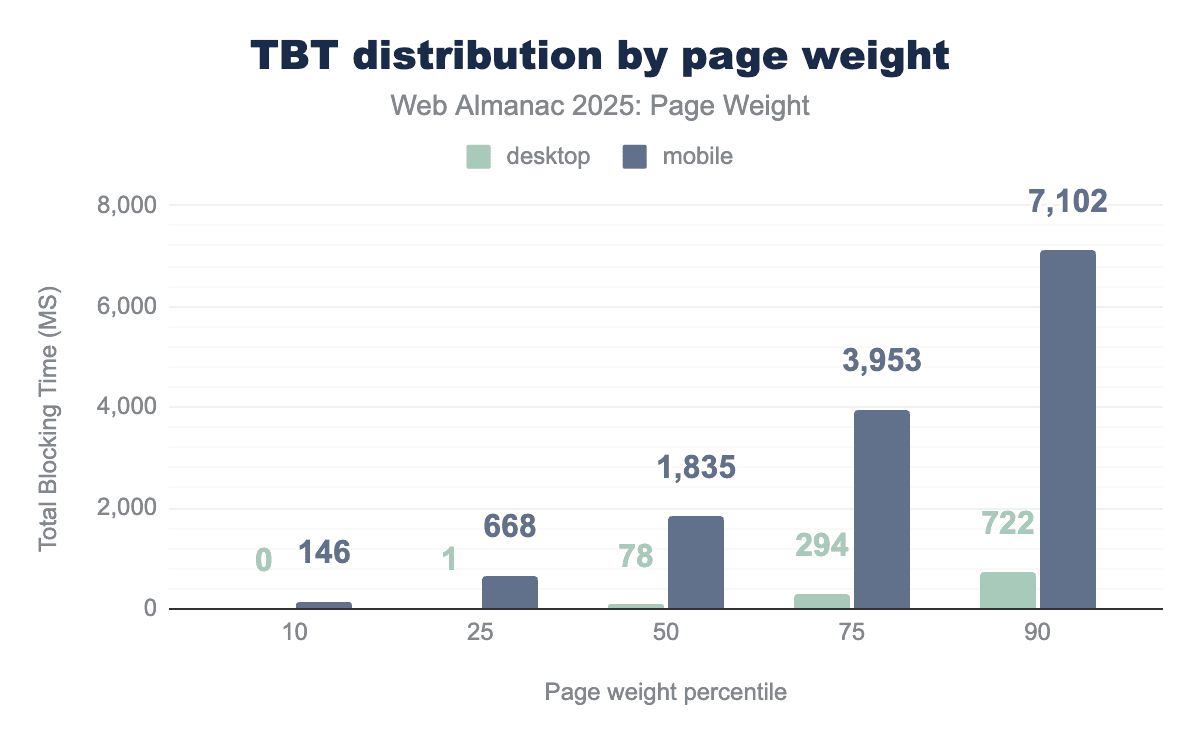 A page is considered to have good TBT when the main thread is blocked for less than 200 milliseconds. Only the 10th percentile of mobile pages achieved this metric. Desktop pages achieved a TBT of under 200 ms through the 50th percentile. At the 90th percentile, the main thread of mobile devices was blocked for 7.1 seconds.