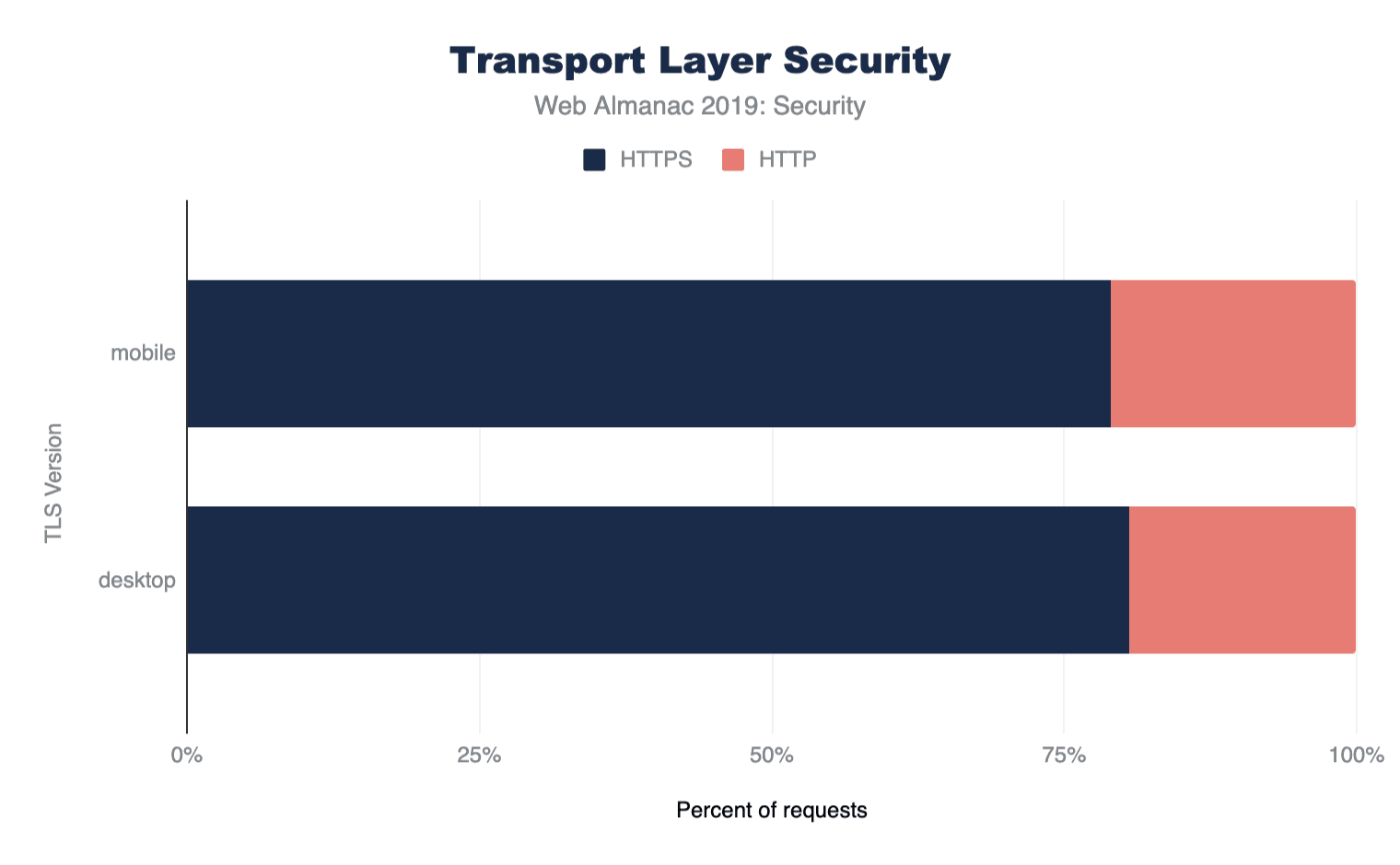ここ数年の間に、転送中データの暗号化については、Webが最も進歩しています。TLSセクションで説明したように、ブラウザーベンダー、開発者、Let’s Encryptのような認証局の様々な努力のおかげで、HTTPSを使用しているウェブの割合は着実に増加しています。本稿執筆時点では、大多数のサイトがHTTPSで利用可能であり、トラフィックの機密性と完全性が確保されています。重要なことに、HTTPSを有効にしているWebサイトの99%以上では、TLSプロトコルの新しい安全なバージョン(TLSv1.2およびTLSv1.3)が使用されています。GCMモードでのAESなどの強力なcipher suitesの使用率も高く、すべてのプラットフォームで95%以上のリクエストを占めています。