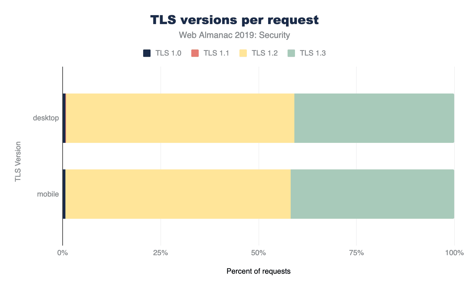 Forward Secrecyを提供するTLSリクエストの割合を見ると、サポートが非常に大きいことがわかります。デスクトップの96.92%、モバイルリクエストの96.49%がForward Secrecyを使用しています。TLSv1.3の採用が継続的に増加していることから、これらの数字はさらに増加すると予想されます。