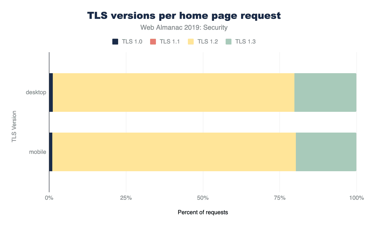 現在、オンラインでのセキュリティとプライバシーを向上させるための最大の後押しは、おそらくトランスポート・レイヤー・セキュリティ(TLS)の普及です。TLS(または古いバージョンのSSL)は、HTTPSの「S」を提供し、安全でプライベートなWebサイトのブラウジングを可能にするプロトコルです。ウェブ上でのHTTPSの使用が大幅に増加しているだけでなく、TLSv1.2やTLSv1.3のような最新バージョンのTLSが増加していることも重要です。