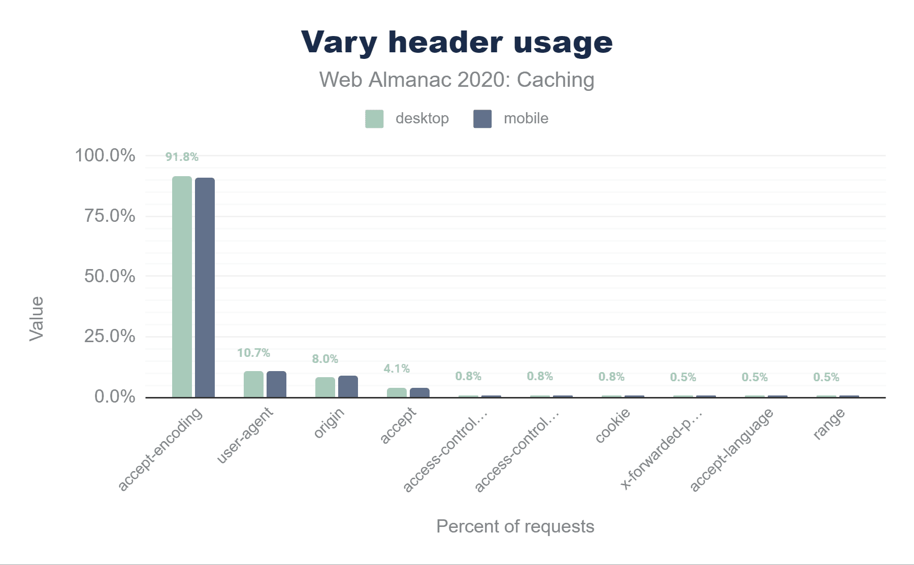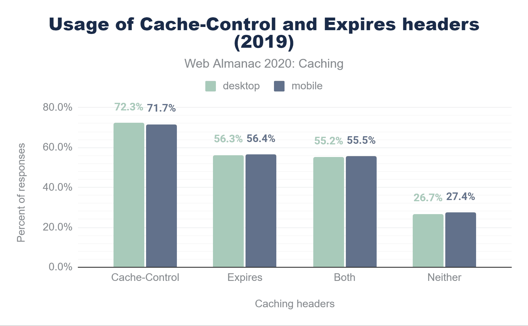 また、デスクトップでは、Cache-Controlヘッダーの使用がわずかに増加(1.8%)していますが、古いExpiresヘッダーの使用はわずかに減少(0.2%)しています。デスクトップでは、Cache-Controlがわずかに増加し(1.3%)、Expiresの増加は少ない(0.8%)ことがわかります。つまり、デスクトップのサイトでは、ExpiresではなくCache-Controlヘッダーを追加するケースが増えているようです。
