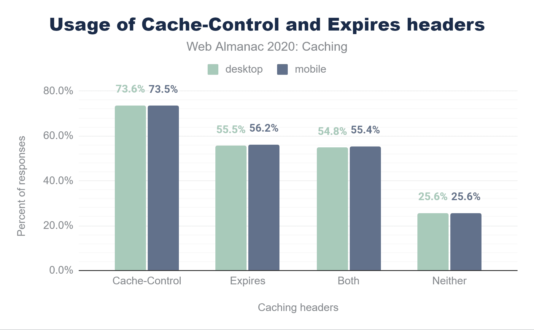モバイルのレスポンスのうち73.5%はCache-Controlヘッダーが付いており、56.2%はExpiresヘッダーが付いていますが、レスポンスに両方のヘッダーが含まれているため、これらのほぼすべて(55.4%)は使用されません。25.6%のレスポンスはどちらのヘッダーも含まれていないため、ヒューリスティックキャッシングの対象となります。