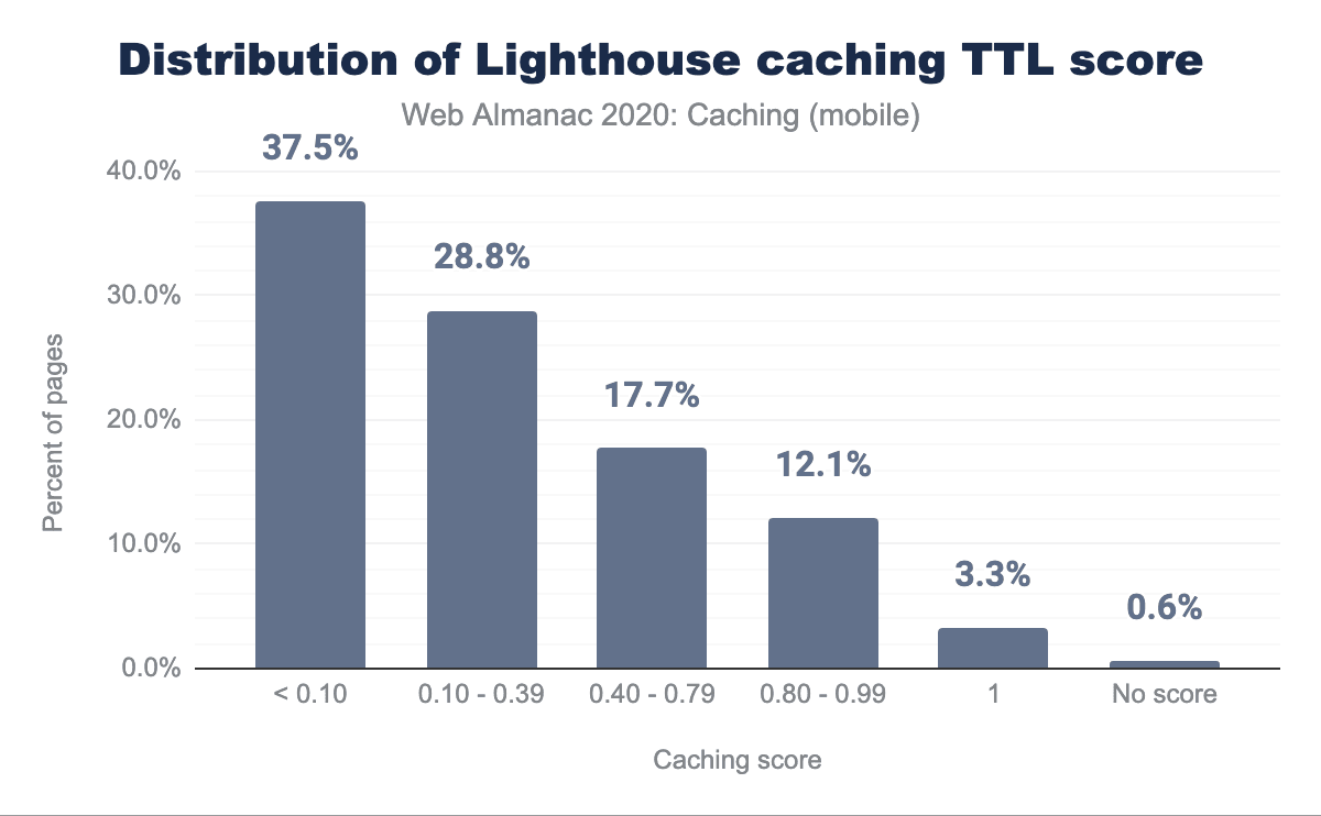100%のスコアを獲得したサイトはわずか3.3%であり、大多数のサイトがキャッシュの最適化によって恩恵を受けることができると考えられます。約3分の2のサイトが40%を下回り、約3分の1のサイトが10%を下回りました。このことから、かなりの量のキャッシュが不足しており、ネットワーク上で過剰なリクエストやバイトが処理されていることがわかります。