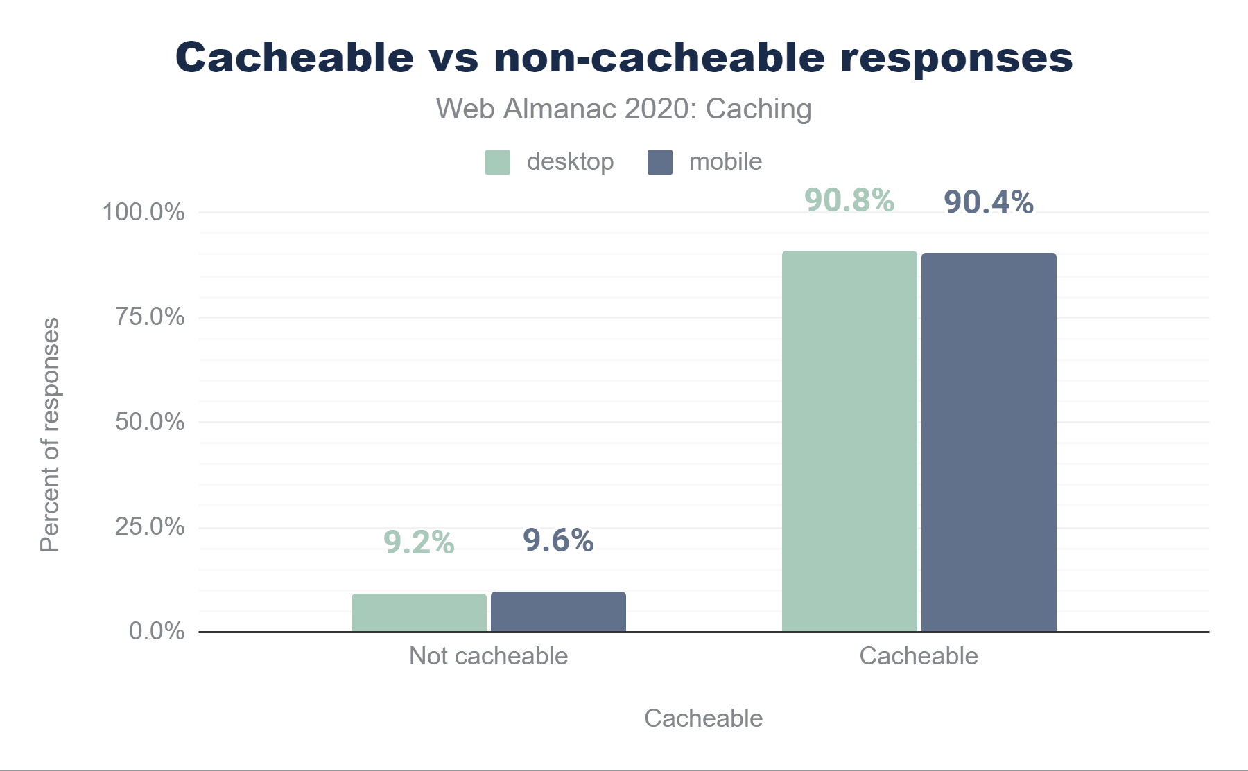すべてのHTTP(S)リクエストにおいて、90.4%のレスポンスがキャッシュ可能であると考えられています(つまり、キャッシュの保存が許可されています)。残りの9.6%のレスポンスは、ブラウザのキャッシュに保存できません。
