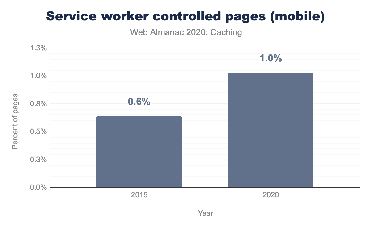 採用率はウェブサイトの1%にとどまっていますが、2019年7月以降、着実に増加しています。Progressive Web Appの章では、上のグラフで1回しかカウントされていない人気サイトでの利用により、このグラフが示す以上に多く利用されていることなど詳しく説明しています。