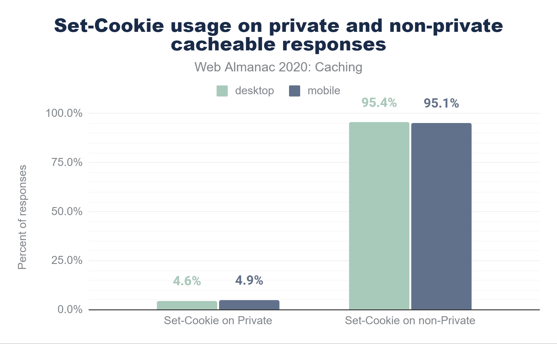 キャッシュ可能なモバイルレスポンスのうち、40.4%がSet-Cookieヘッダーを含んでいます。これらのレスポンスのうち、privateディレクティブを使用しているのは4.9%。残りの95.1%(1億9,860万のHTTPレスポンス)は、少なくとも1つのSet-Cookieレスポンスヘッダーを含んでおり、CDNなどのパブリックキャッシュサーバでキャッシュできます。これは、キャッシュ機能とCookieがどのように共存しているのか、理解されていないことを示しているのかもしれません。