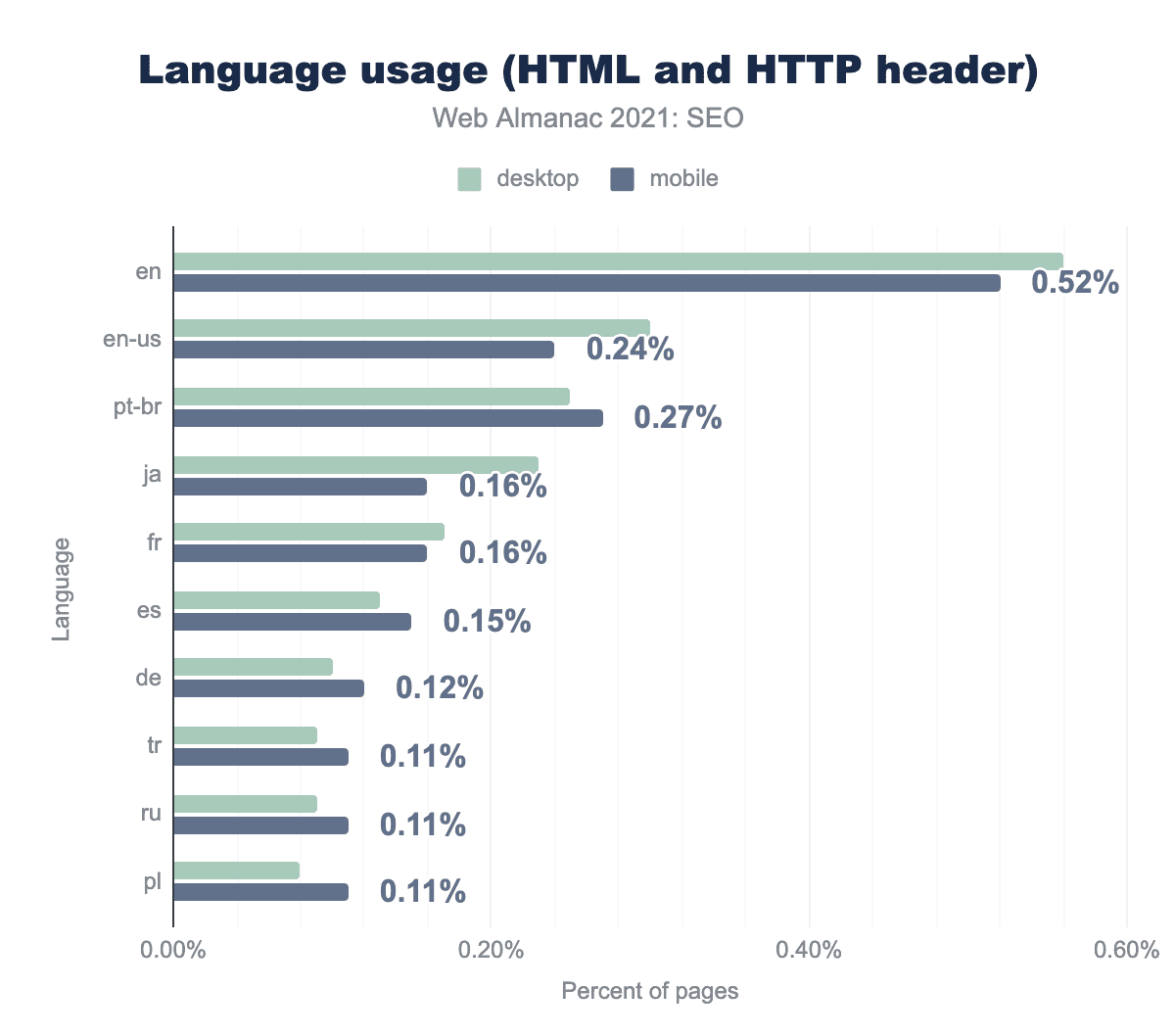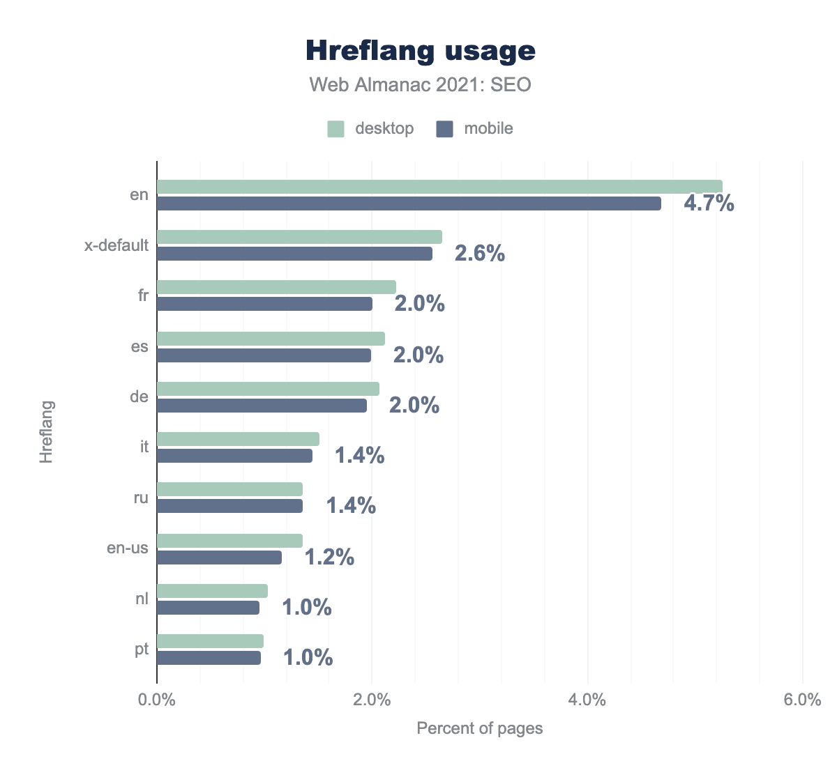 en(英語版)で、hreflang属性(全言語)はデスクトップおよびモバイルページの5%未満にしか実装されていませんでした。デスクトップ用ページの9.0%、モバイル用ページの8.4%がhreflang属性を使用しています。