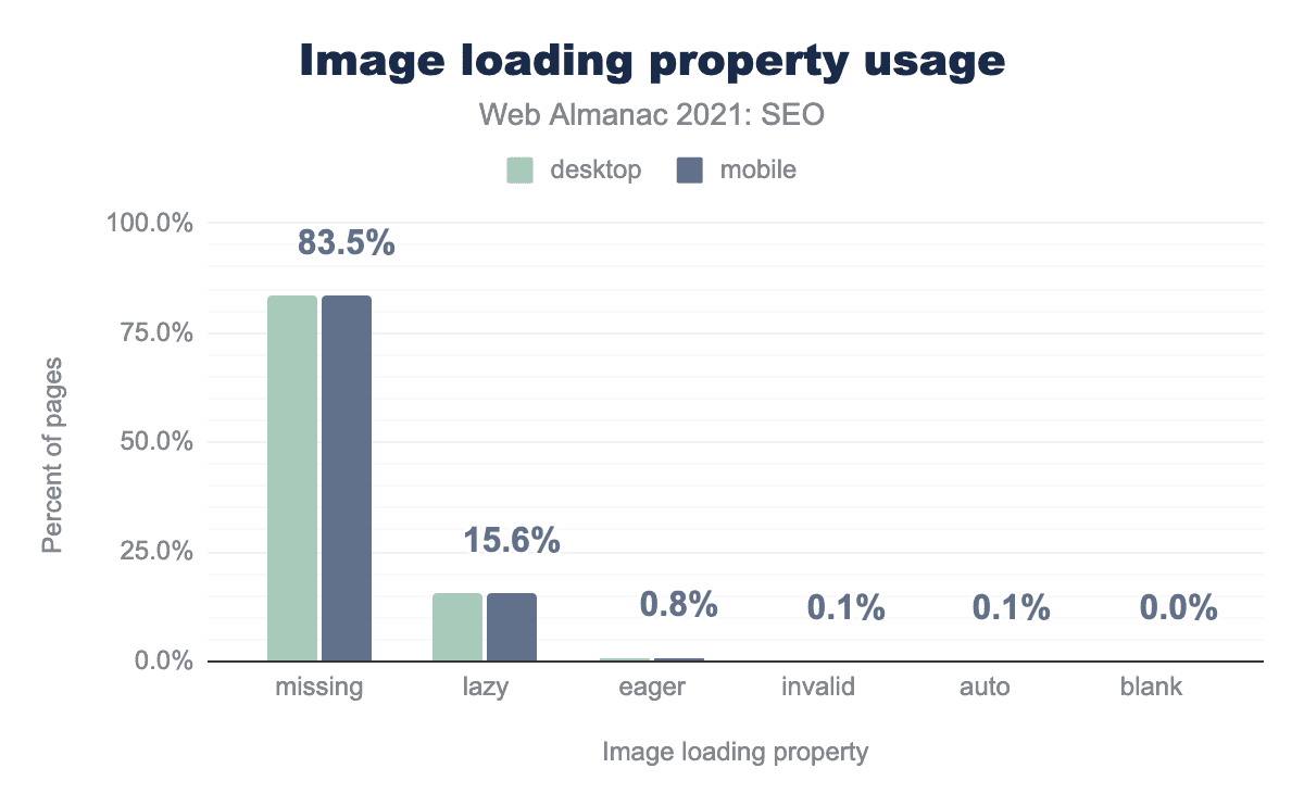 loading="lazy" を使用しており、loading="eager" はデスクトップとモバイルのページの0.8%に過ぎないことがわかりました。その他のケースは、デスクトップとモバイルのページで1%未満です。これには、無効なプロパティや空白のプロパティ、または loading="auto" を持つケースが含まれます。私たちはそれを見たのです。