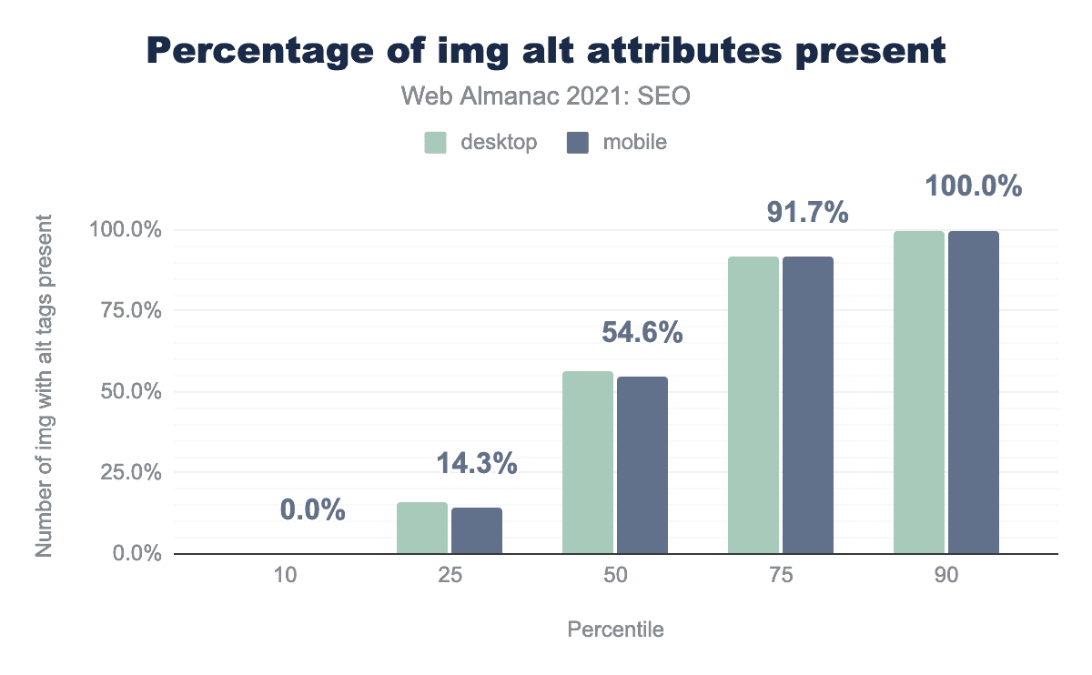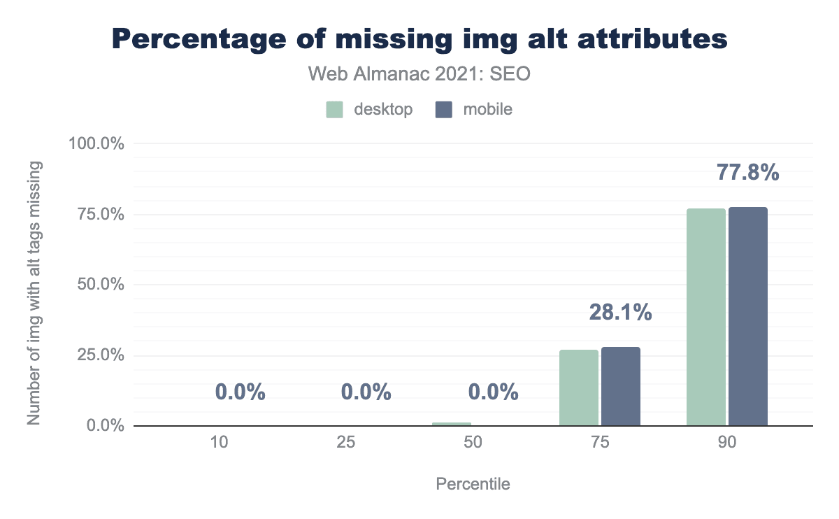 alt属性がフィーチャーされる割合を示す棒グラフ。中央のウェブページでは、デスクトップで10.5%、モバイルでは11.8%の空白のalt属性が表示されています。alt 属性が空白の割合。