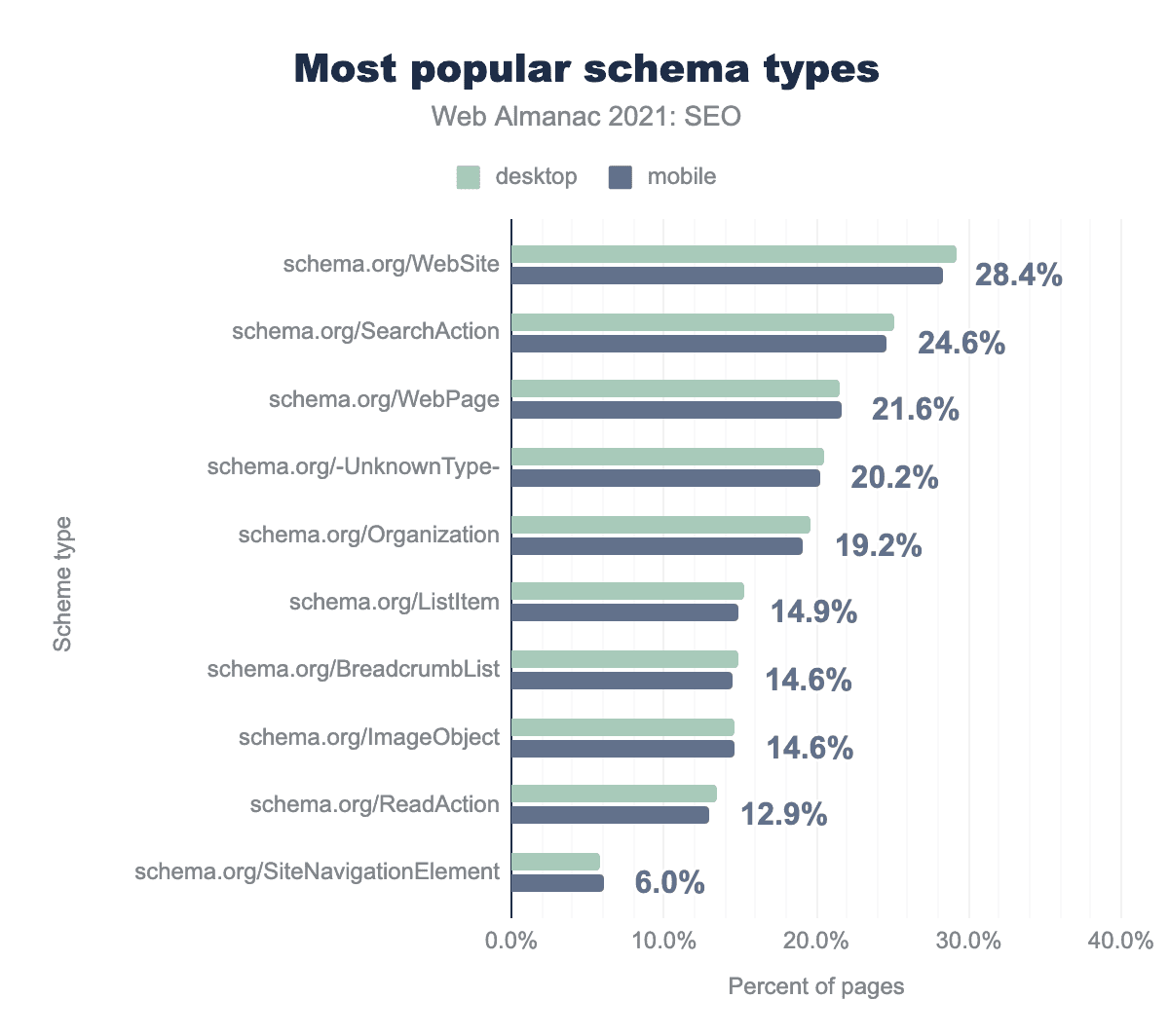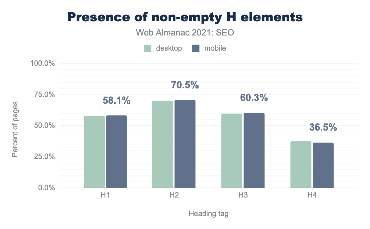 h1の見出しは65.4%のページに、h2は71.9%のページにもっとも多く、h33は61.8%のページに、h4の見出しは37.6%のページに見受けられた。主な見出しについては、 h1(65.4%)よりも多くのページ(71.9%)にh2があります。この差に明確な説明はありません。デスクトップとモバイルのページの61.4%は h3 を使い、h4 は39%以下です。