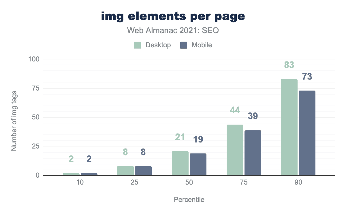 <img>タグがあり、モバイル用ページの中央値には19個の<img>タグがあります。 - デスクトップページの10%は、83個以上の