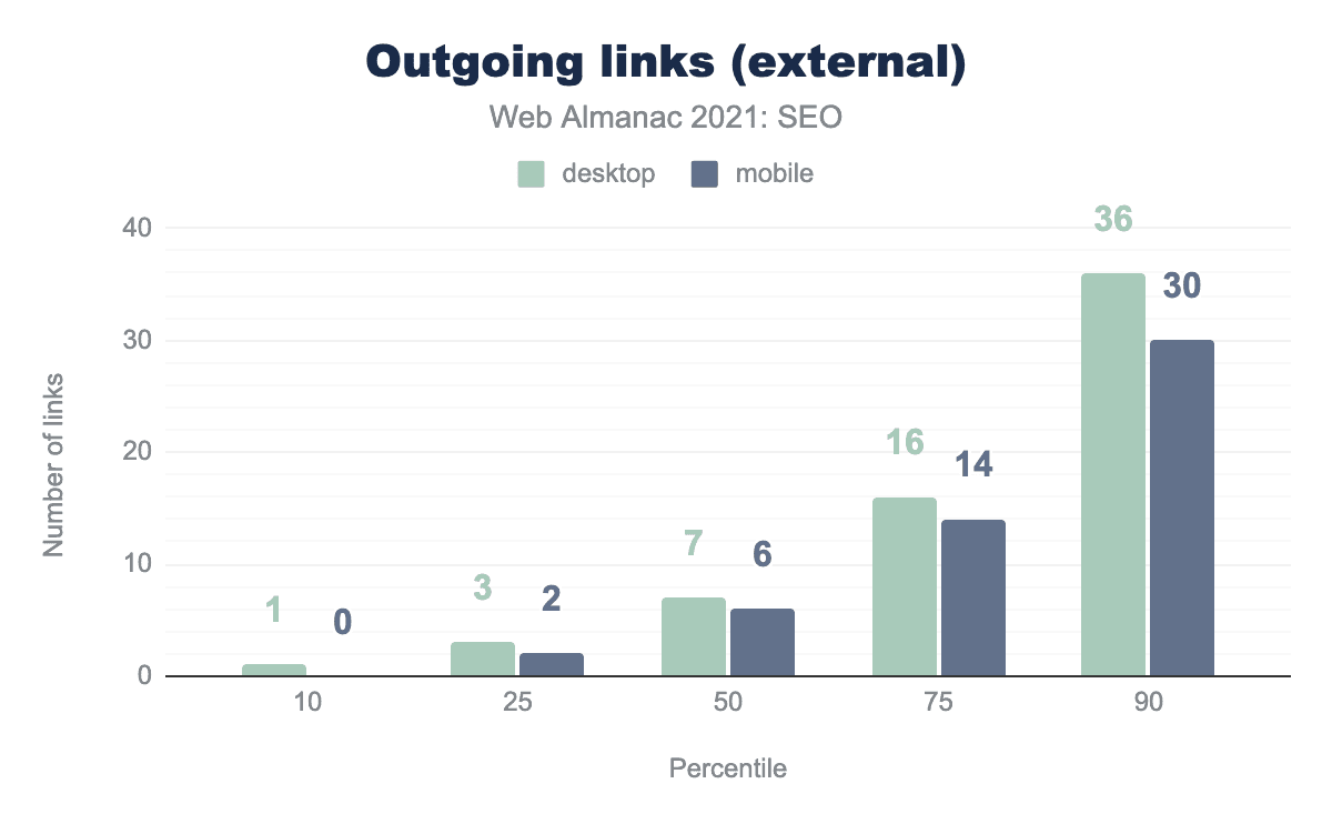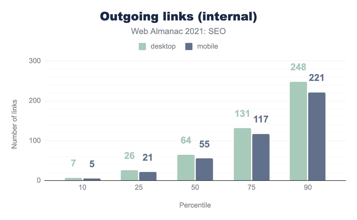このデータによると、デスクトップの内部リンク数の中央値はモバイルよりも16%多く、それぞれ64対55となっています。これは、開発者が小さい画面でも使いやすいように、モバイルではナビゲーションメニューやフッターを最小限にする傾向があるためと思われます。