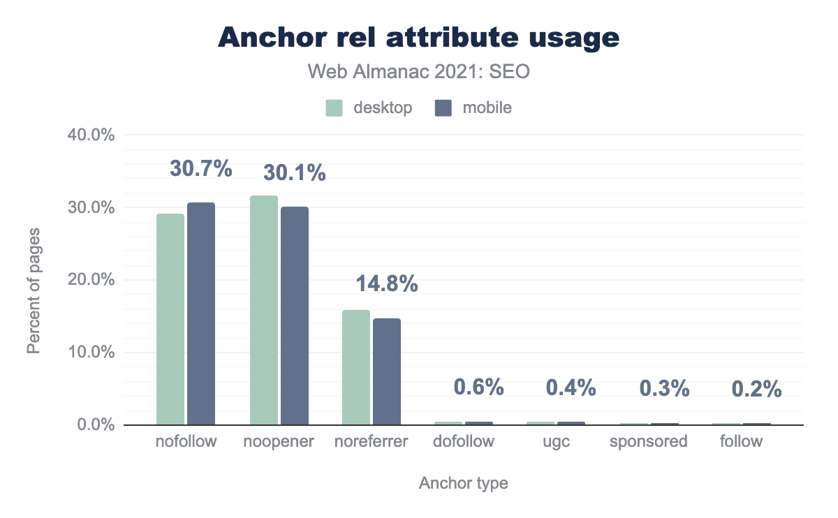 rel="nofollow"は30.7%のモバイルページで見つかり、昨年と同様でした。この属性は非常に多く使われているため、Googleがnofollowをヒントに変更したのは当然のことで、つまり、それを尊重するかどうかを選択できるようになったのです。