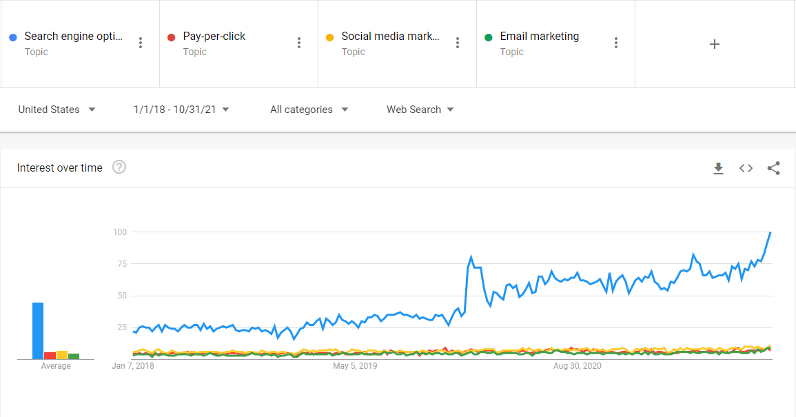 SEOはかつてないほど人気があり、企業が顧客にアプローチする新しい方法を模索する中で、ここ数年大きな成長を遂げています。SEOの人気は、他のデジタルチャネルをはるかにしのいでいます。