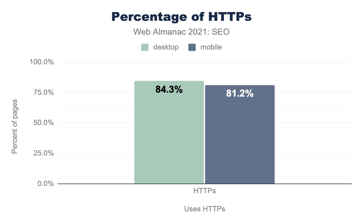 HTTPSの採用は依然として増加している。モバイルページの81.2%、デスクトップページの84.3%でHTTPSがデフォルトとして採用されました。これは、前年比でモバイルサイトでは約8%、デスクトップサイトでは7%増加しています。