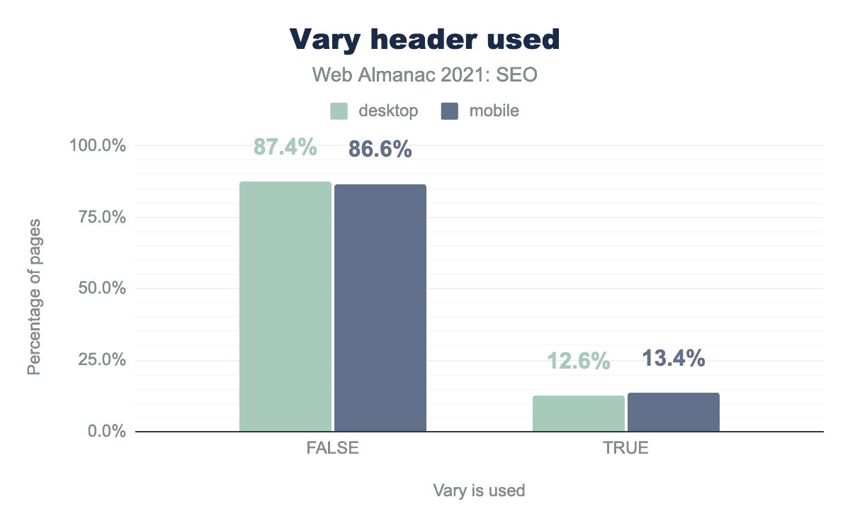 また、Vary: User-Agentヘッダーについては、このフットプリントのデスクトップページの12.6%、モバイルページの13.4%がこのヘッダーを使用しており、数値はほとんど変わりません。