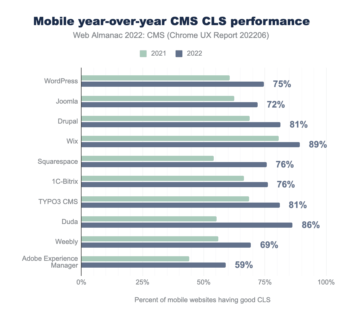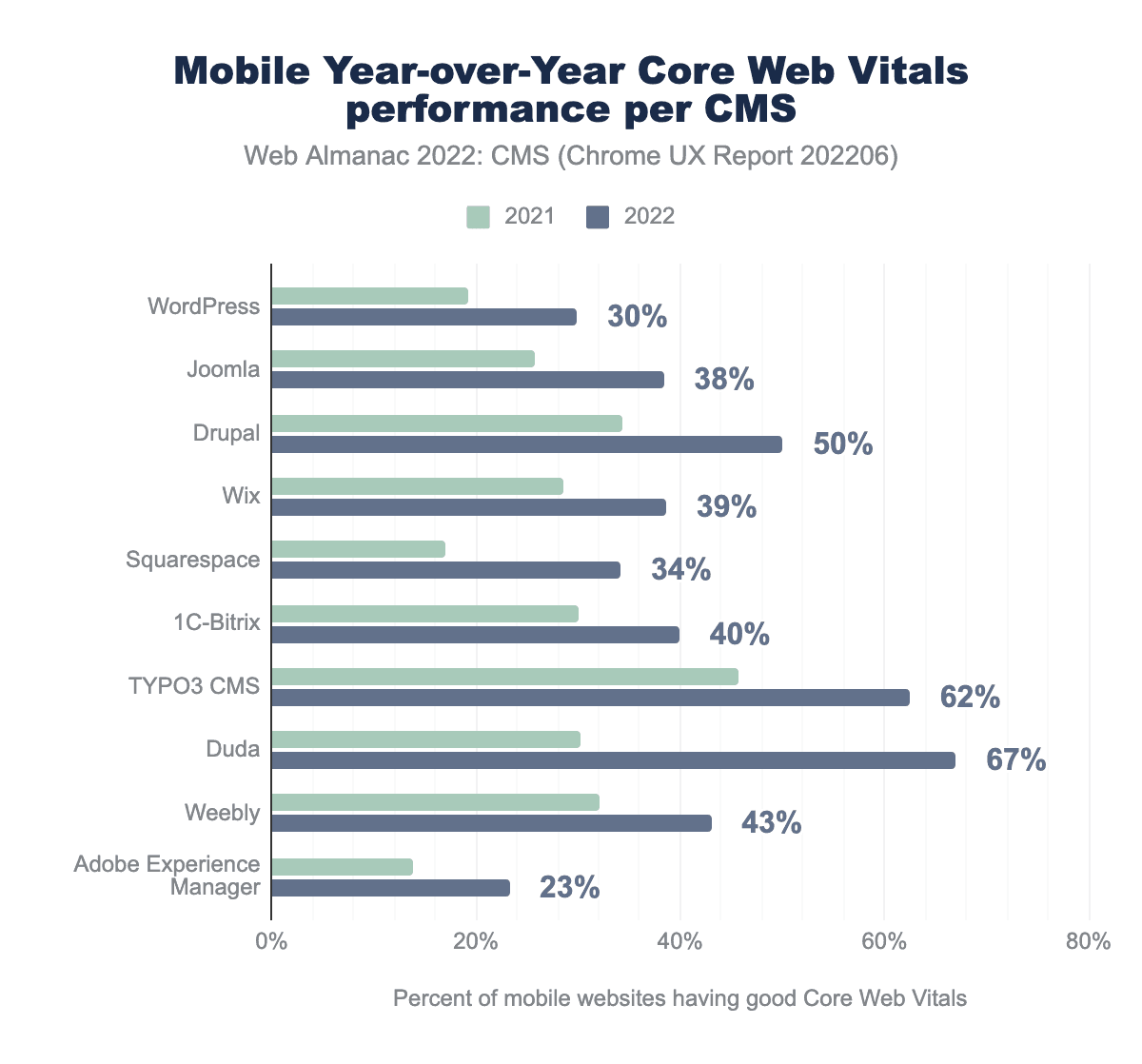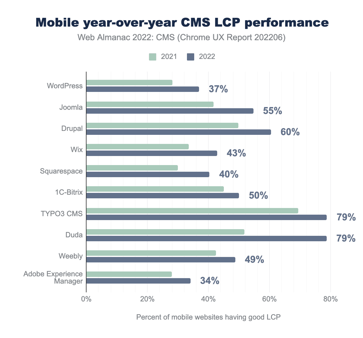 また、これらのCMSプラットフォームのモバイルデバイス上でのパフォーマンスの進捗を、昨年のデータと比較して評価できます。