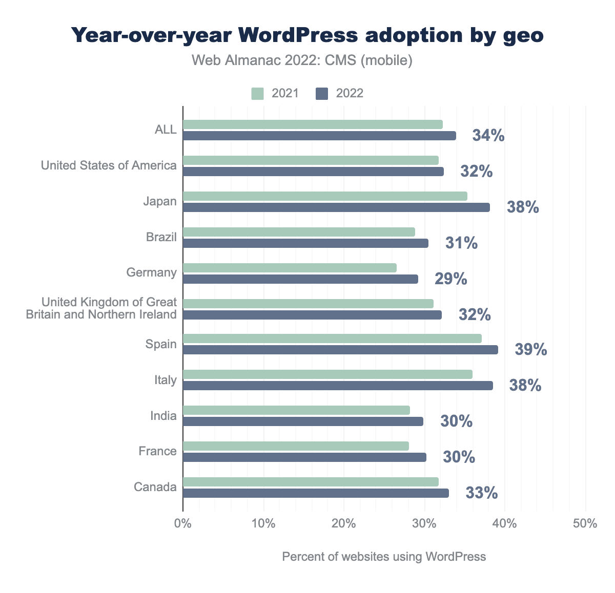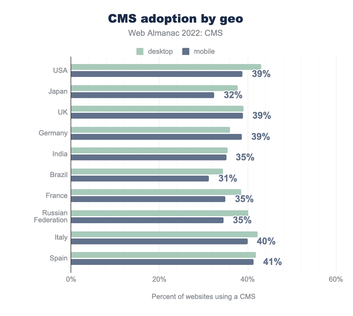 ウェブサイト数がもっとも多い国の中で、CMSの採用率がもっとも高いのはイタリアとスペインで、モバイルサイトの40%〜41%がCMSで構築されています。ブラジルと日本では、採用率がそれぞれ31%と32%ともっとも低いです。