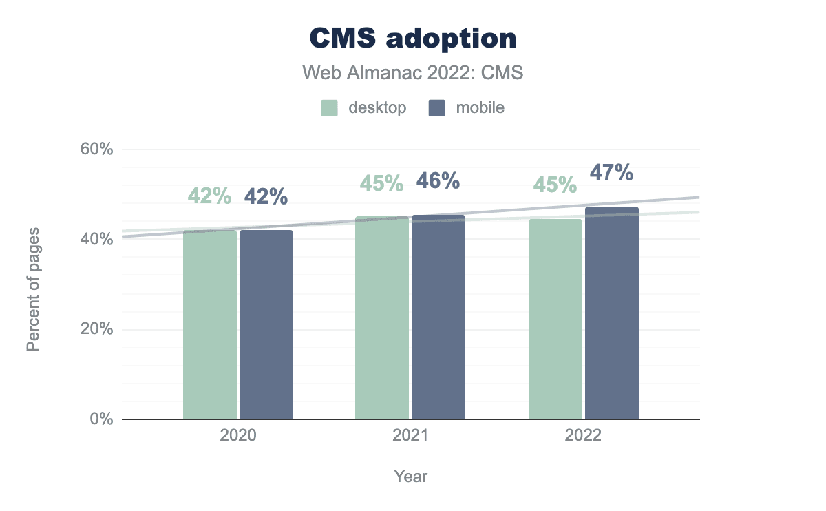 2022年6月の時点で、Web Almanacのデスクトップデータセット内のウェブサイトの45%がCMSによって運営されており、2021年と同様の利用状況を示しています。モバイルデータセットでは、2021年の46%から2022年には47%に増加しています。デスクトップの生データを詳しく見ると、絶対数および割合の両方でわずかな減少が見られますが、この減少はCMSの使用率の低下を示すものではなく、割り当ての小さな変動によるものである可能性が高いです。デスクトップサイトの数がHTTP Archive(ソースであるCrUXデータセット)で640万サイトから540万サイトに大幅に減少した一方で、モバイルサイトの数は750万サイトから約40万サイト増加して790万サイトに達しました。この増加は、デスクトップの代わりにモバイルデバイスの使用が引き続き成長していることを反映していると考えられます。