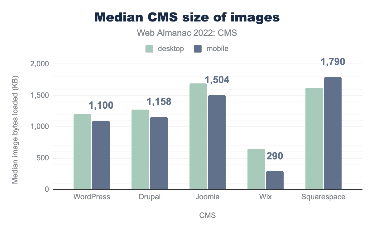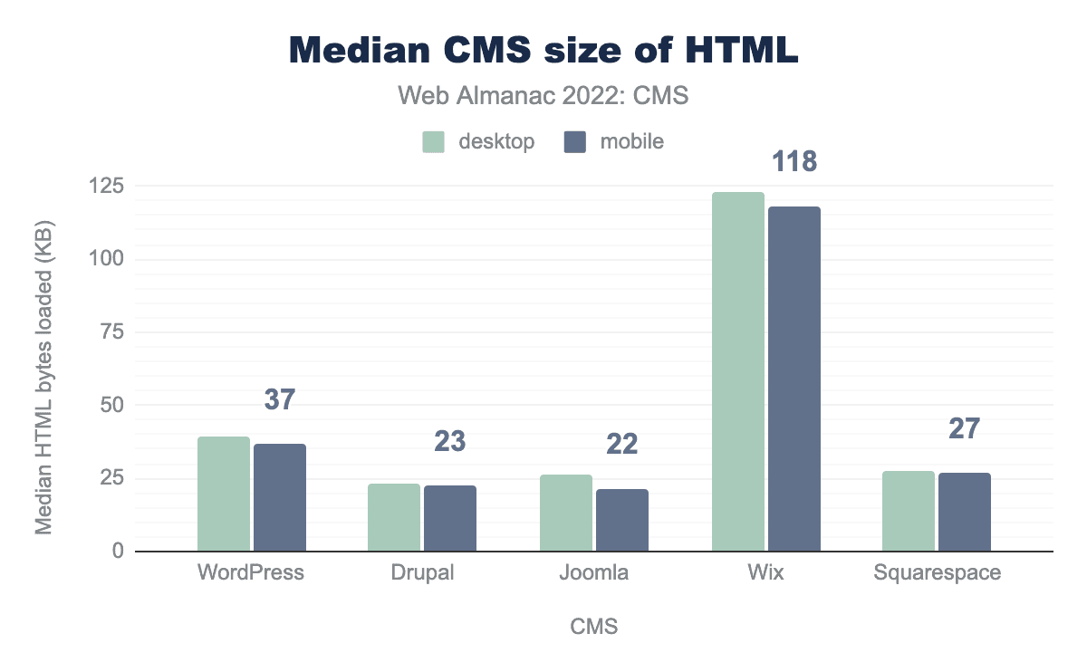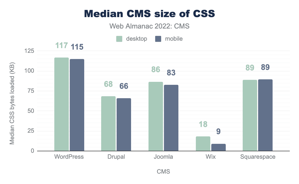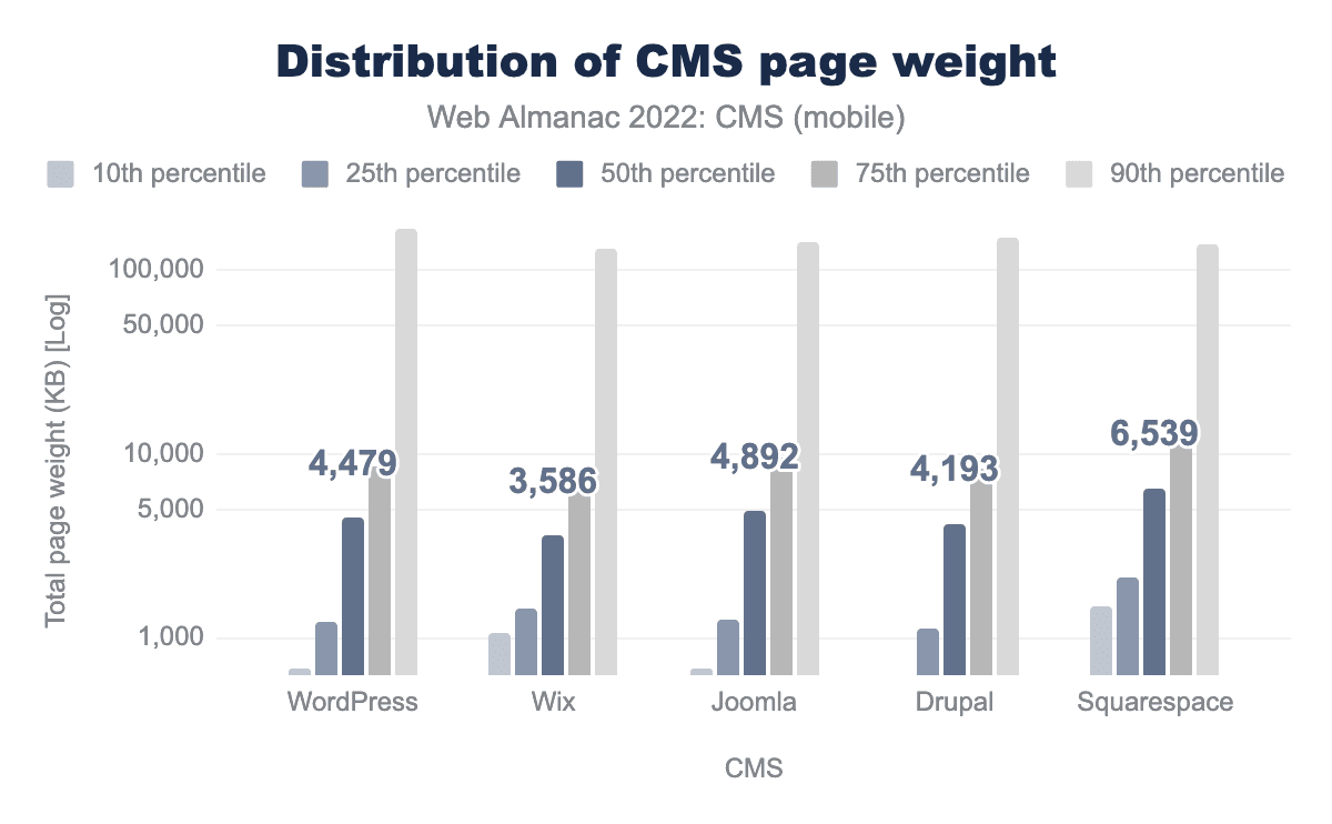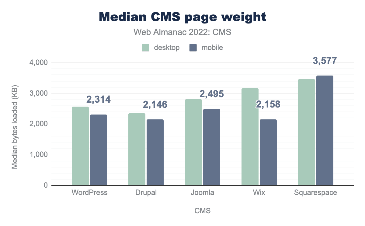 上位5つのCMSのほとんどは、約2 MBの中央ページ重量を提供していますが、Squarespaceは約3.5 MBと大きくなっています。Joomlaを除くすべてが2021年のデータからページ重量の増加を示しています。