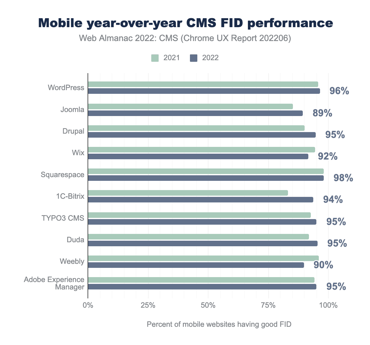 年次データは、ほとんどのCMSが過去1年間でFIDを改善したことを示しています。WixとWeeblyは前年のデータよりもいくつかのパーセンテージポイント後退しました。