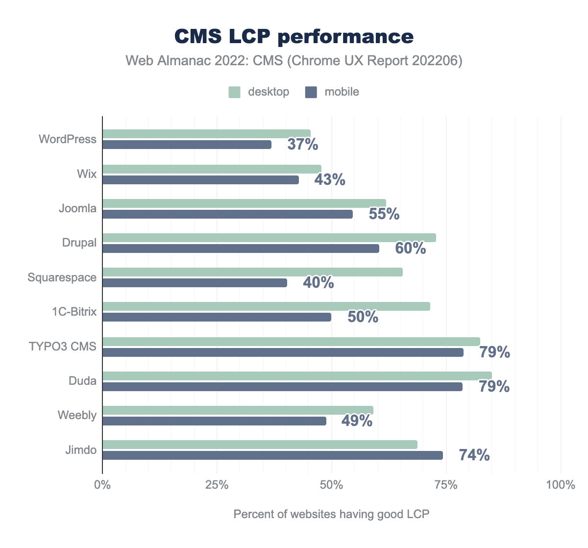 図18.8. CMS別の良好なLCPを持つサイトの割合。