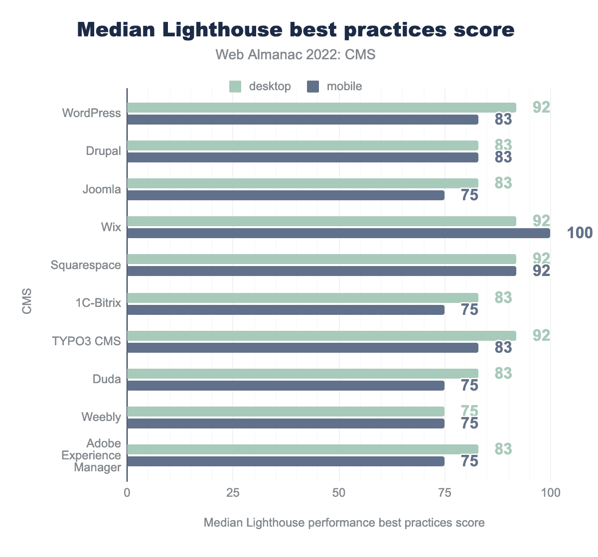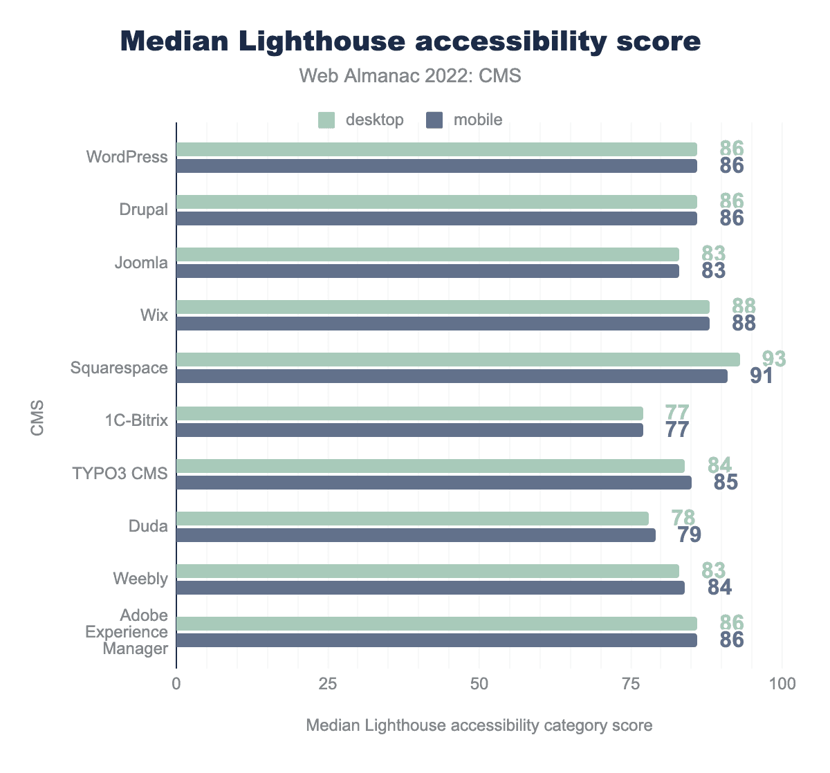トップ10のCMSのLighthouseアクセシビリティスコアの中央値は77から91の範囲です。Squarespaceが最高スコアの91を持ち、1C-Bitrixが最低のアクセシビリティスコアを持っています。デスクトップスコアはモバイルとほぼ同一であり、デスクトップとモバイルデバイスに同じサイトが配信されていることを反映している可能性があります。