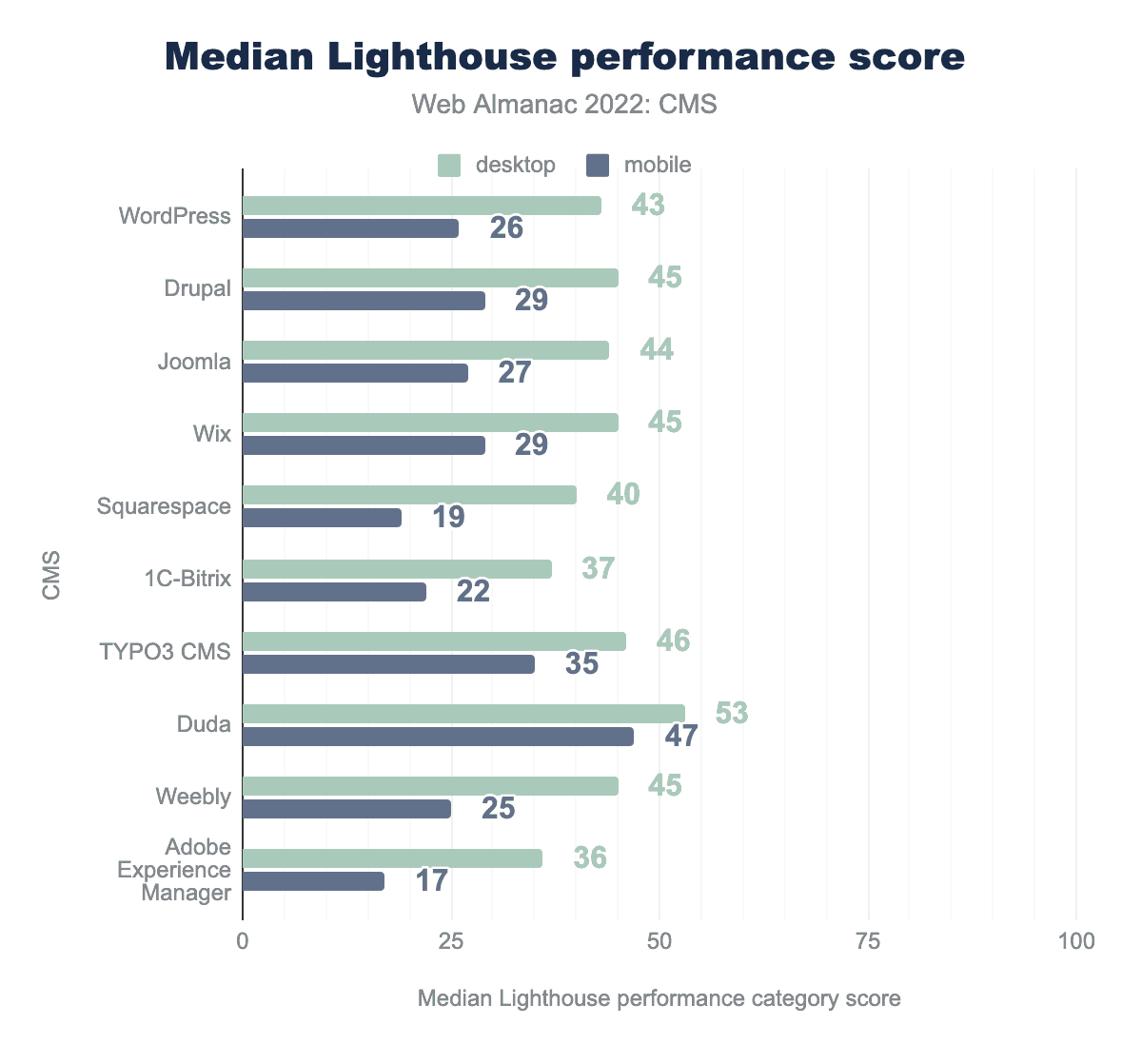 ほとんどのプラットフォームのモバイルでの中央値パフォーマンススコアは低く、約19から35の範囲です。Dudaの47は例外です。Philip Waltonが2021年に指摘したように、これがモバイルフィールドデータの悪い結果を直接示すわけではありませんが、すべてのプラットフォームが改善の余地があり、とくにLighthouseがエミュレートしようとしているようなネットワーク接続を持つ低性能デバイスでの改善が必要です。