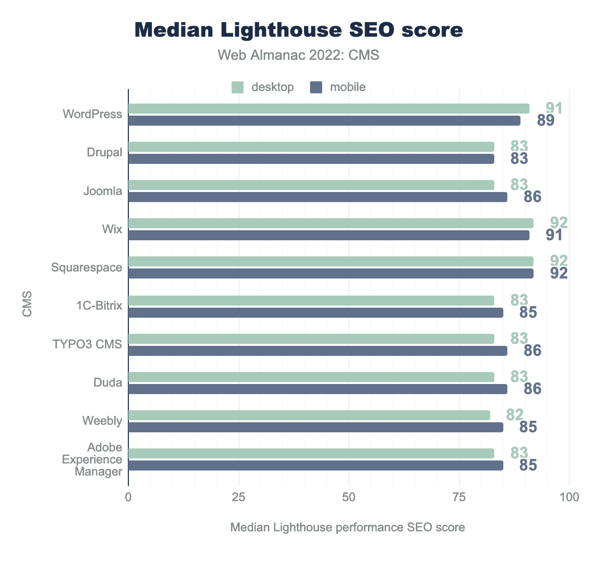 トップ10のプラットフォームの中央値SEOスコアは83から92の範囲で、2021年の84から95からわずかに減少しました。デスクトップスコアは似ており、いくつかの場合はわずかに良く、他の場合はわずかに悪くなっています。