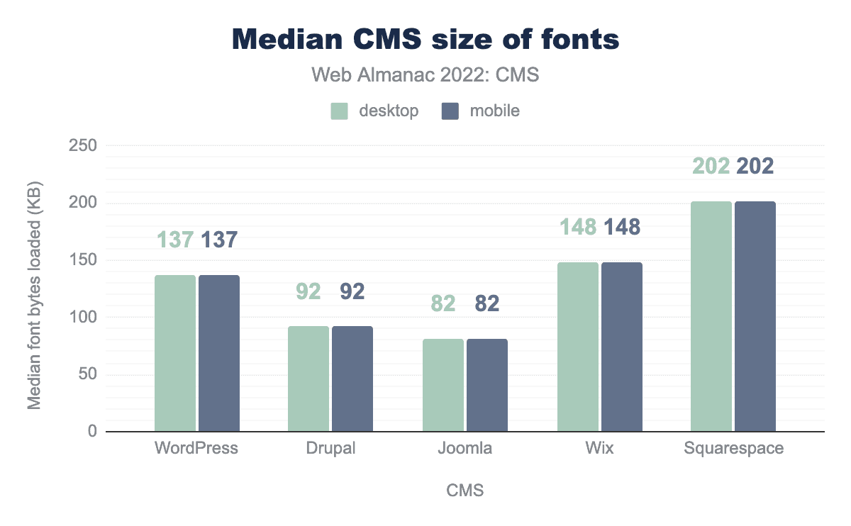 テキストを表示するために、ウェブ開発者はしばしばさまざまなフォントを使用します。Joomlaはモバイルビューでもっとも少ないフォントバイトを提供し、82 KBです。Squarespaceはもっとも多く202 KBを提供します。