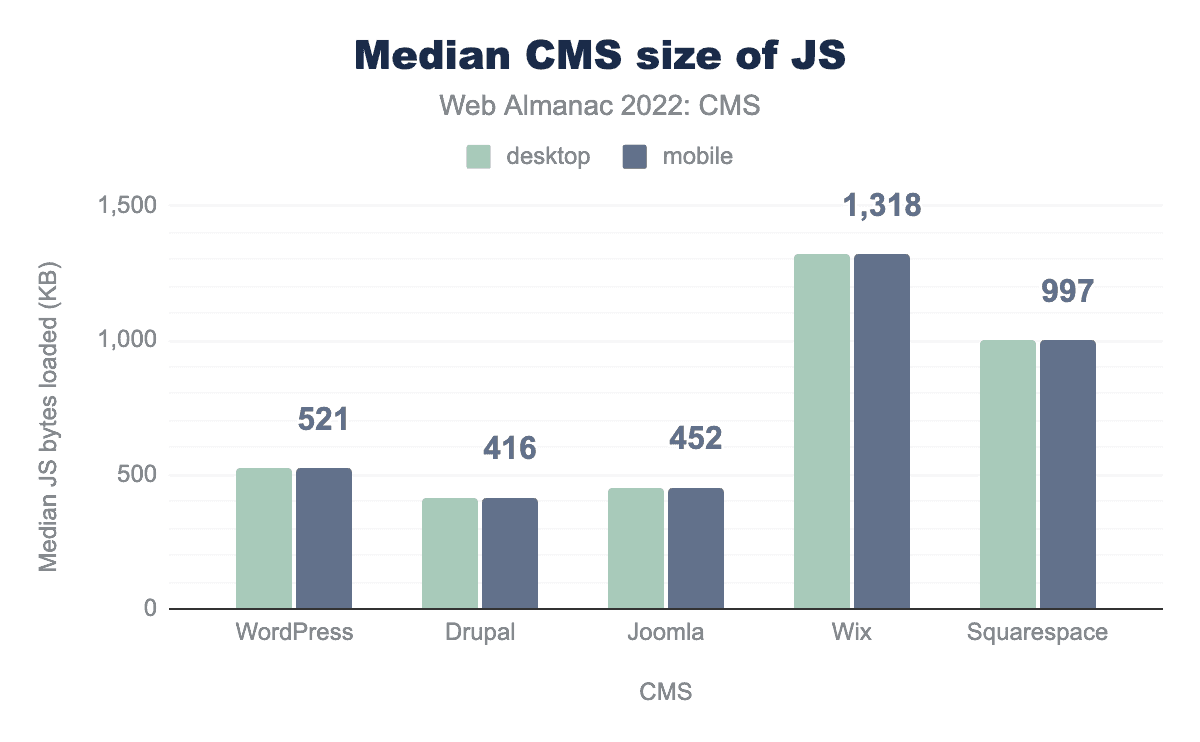 上位5つのCMSはすべてJavaScriptに依存するページを提供しており、Drupalがもっとも少ないJavaScriptバイトを提供しています:モバイルで416 KBです。Wixは1.3 MB以上のJavaScriptバイトを提供し、もっとも多くなっています。