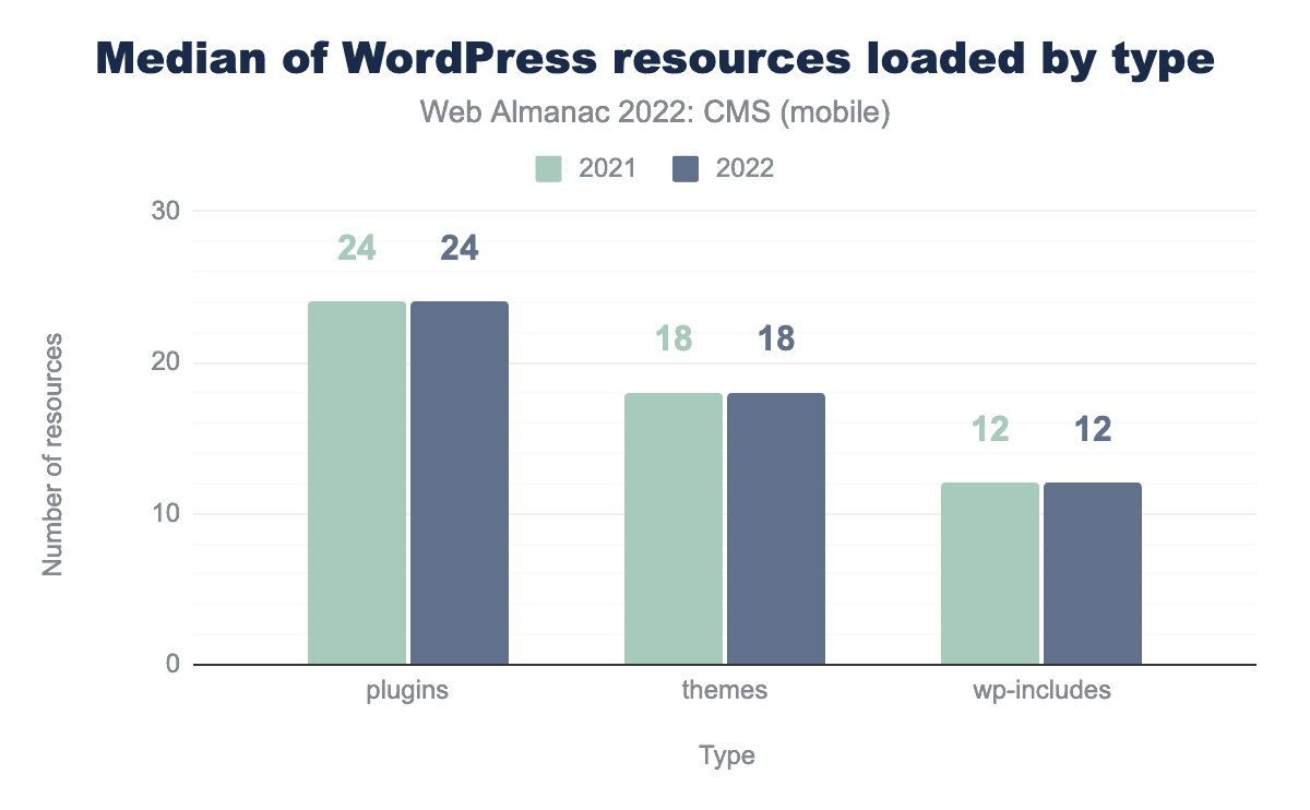 年を追うごとに使用されるリソースの数に目立った変化はありません。来年も再度調査を行い、人気のあるテーマやプラグインのパフォーマンスへの影響をさらに詳しく見ていくかもしれません。