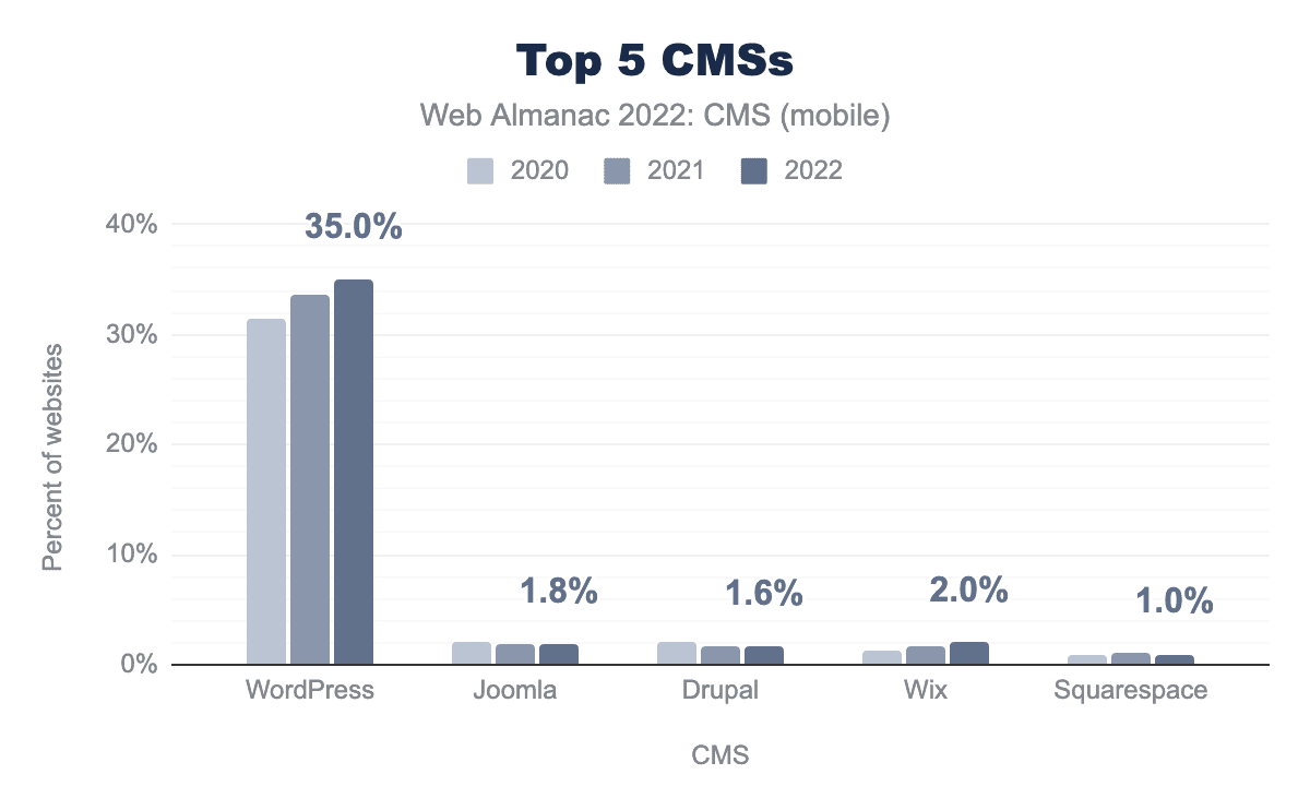 特定可能なCMSを使用しているすべてのウェブサイトの中で、WordPressサイトは相対的な市場シェアの大部分を占めており、モバイルでの採用率は35%以上です。次いでWix(2%)、Joomla(1.8%)、Drupal(1.6%)、Squarespace(1.0%)が続いています。