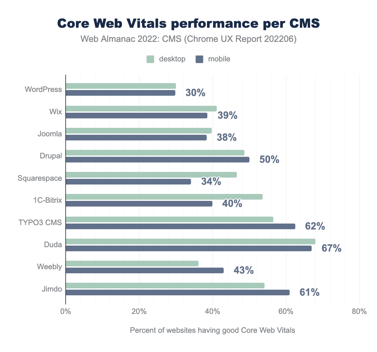 デスクトップデバイスのエクスペリエンスは、ほとんどのCMSでモバイルよりも優れています。Dudaがもっとも高い合格率を持ち、68%です。WordPressは合格サイトの割合がもっとも低く、30%です。