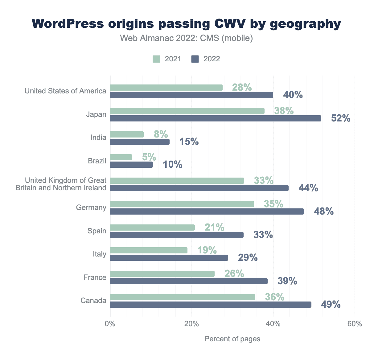 次に、地理的な分布、モバイルデバイスの使用、および2021年の結果との比較に基づいて、Core Web Vitalsの合格スコアを持つWordPressのオリジンの数を調べました。