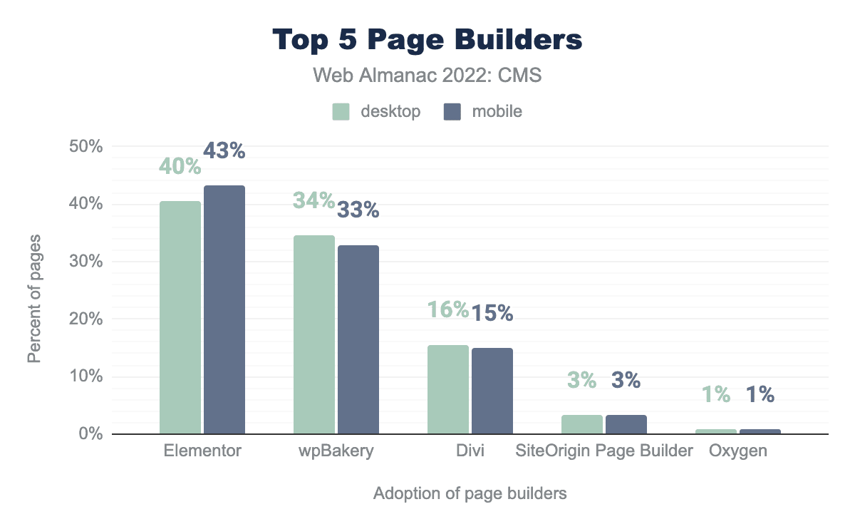 WordPressでは、ユーザーがコンテンツ管理用のインターフェイスを提供する「ページビルダー」をよく利用します。今年はWappalyzerの検出方法が向上したため、ページビルダーの採用状況を調査しました。その結果、ページビルダーが割り当てられているWordPressサイト(私たちのデータセット内のすべてのWordPressサイトの約34%)の中で、ElementorとWP Bakeryが明確な勝者であり、Divi、SiteOrigin、Oxygenがそれに続いていることがわかりました。
